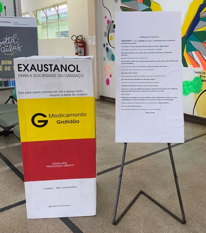Objetivo: Criar uma instalação artística imersiva que critique os dilemas da sociedade atual — como o cansaço extremo, a alienação, o consumismo e a superficialidade — por meio de grandes caixas de remédios que simbolizam as “curas ilusórias” para esses problemas. A ideia é provocar reflexão e uma tomada de consciência. Conceito da Instalação: Cada caixa de remédio será uma metáfora visual, com design inspirado em embalagens farmacêuticas, mas com nomes e bulas fictícias que expõem as “doenças sociais”. A proposta é que o público transite entre as caixas, leia as descrições e reflita sobre as temáticas abordadas. Exemplos de Caixas e Bulas: “Exaustanol” — Para a sociedade do cansaço Promete energia infinita, mas cobra o preço do esgotamento emocional e da perda de identidade. Composição: Produtividade tóxica, multitarefa e autocobrança excessiva. Indicações: Para quem precisa ser útil o tempo todo, mesmo à beira do colapso. Posologia: 24 hora,7 dias por semana, sem pausas. Efeitos colaterais: Burnout, insônia, perda de identidade e distanciamento das emoções. Advertências: Pode causar a sensação de que descansar é fracassar.
